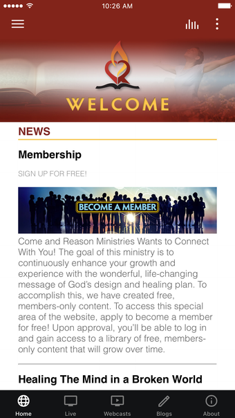 แอปยังให้บล็อกและบทความที่ทำให้คิดถึงโดย Dr. Tim Jennings ประธาน Come And Reason Ministries ดร. เจนนิ้งส์เป็นจิตแพทย์คริสเตียนที่ปฏิบัติงานและเป็นผู้เขียนของ "The God-Shaped Brain" และ "Could It Be This Simple"